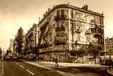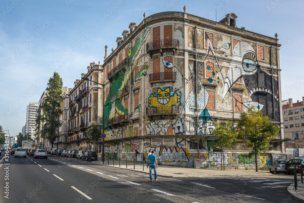 Graffiti on the walls of an old house in the center of Lisbon on a sunny autumn day. Lisbon, Portugal.