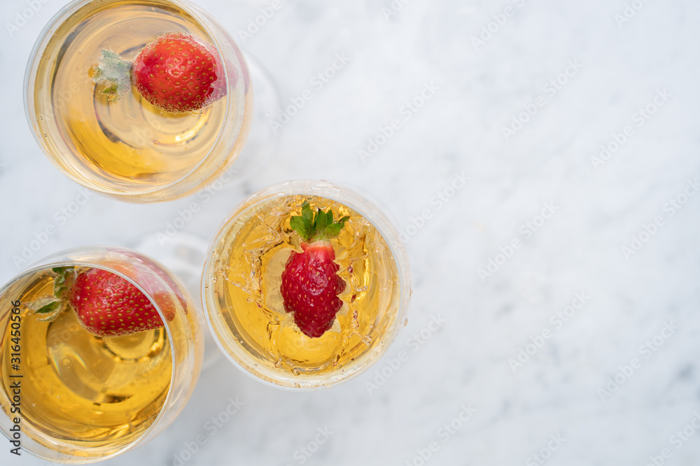 Strawberry Falling with Splash into Glass of White Wine from Above with Copy Space