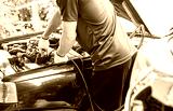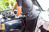 Close up of man hand charging a car battery using electricity trough jumper cables.