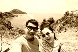 Happy traveling couple taking selfie on the mountain against the ocean.