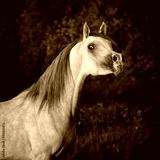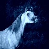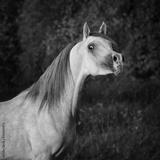 Head of a beautiful grey Arabian horse with a long mane on natural green background closeup portrait.