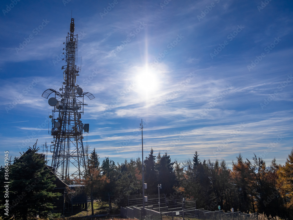 Radio Mast on Mountain top Jaworzyna Krynicka at blue sky and sun background, Poland.