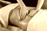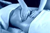Close-up of the hands massaging female abdomen. Therapist applying pressure on belly. Woman receiving massage at medical spa center