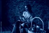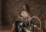 A young attractive woman sits in a chair with a smartphone in her hands.