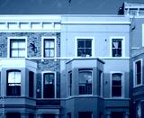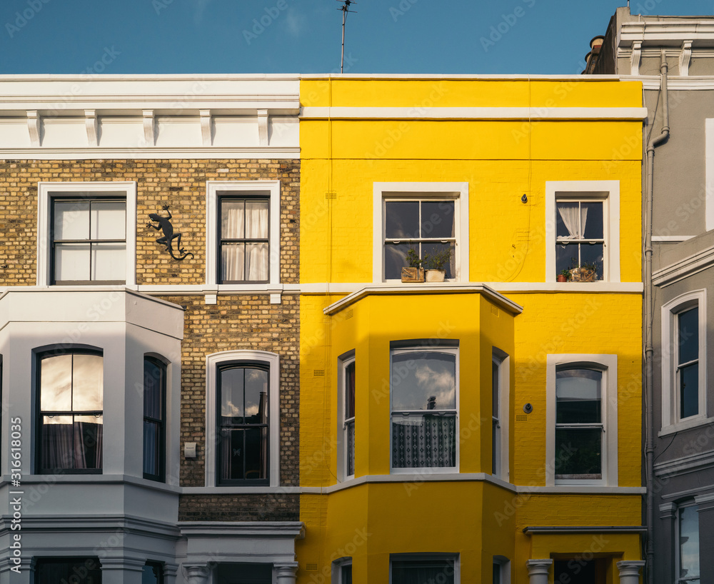 Several colorful houses off of Portobello Road in London, England. Notting Hill neighborhood