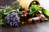 Fresh herbs from the garden and the different types of oils for massage and aromatherapy on table with lavender