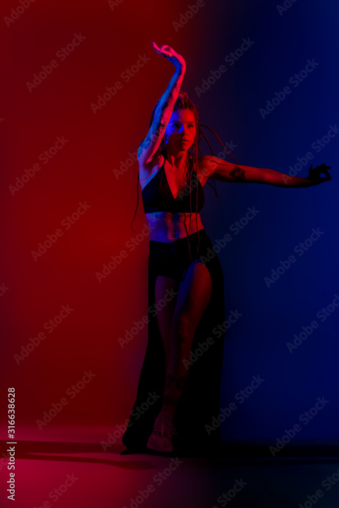 Black dressed and braided hair woman dancing on a blue and red background.