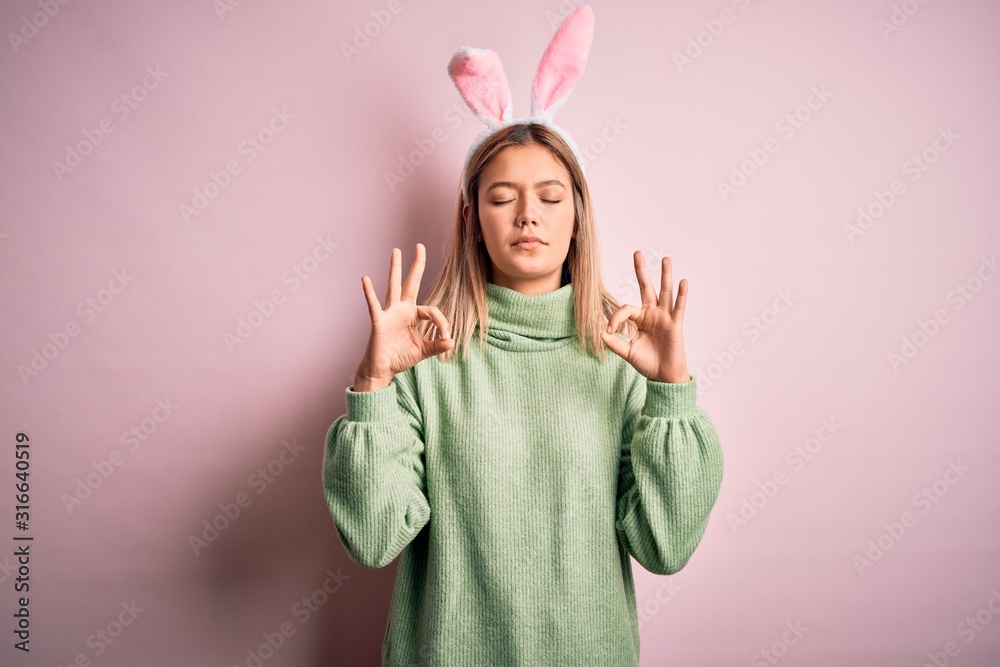 Young beautiful woman wearing easter rabbit ears standing over isolated pink background relax and smiling with eyes closed doing meditation gesture with fingers. Yoga concept.