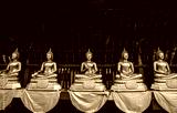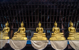 Rows of golden Buddha statue in Seema Malaka buddhist temple on Beira Lake in Colombo, Sri Lanka. Colombo is the commercial capital and largest city of Sri Lanka.