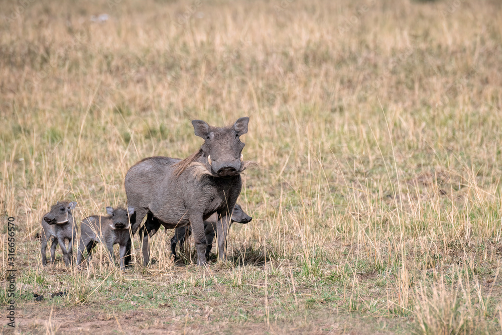 Mother warthog surrounded by her three adorable little babies. Image taken in the Masai Mara, Kenya.