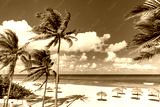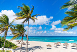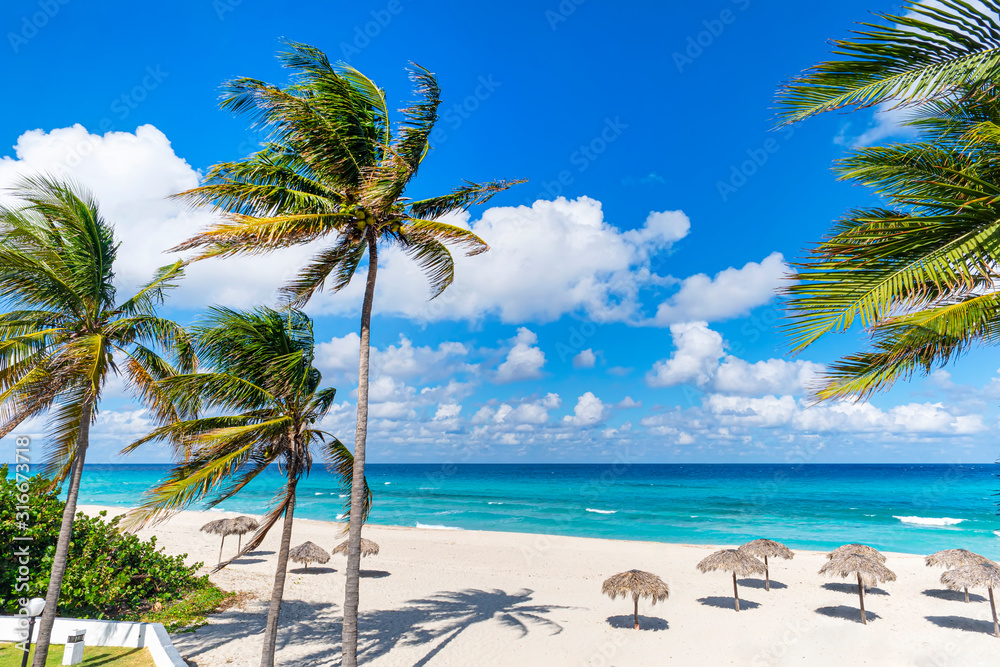 Straw umbrellas and palm trees on beautiful tropical beach. Green palm leaves in the wind on the background of the azure Caribbean sea. beach with white clean sand without people on a Sunny day.