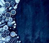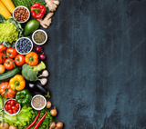 Dieting and healthy eating concept: fruits, vegetables, vegan food ingredients over natural background.