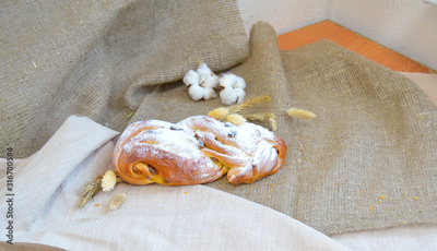 Raisin roll on the tablecloth