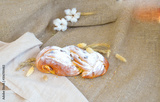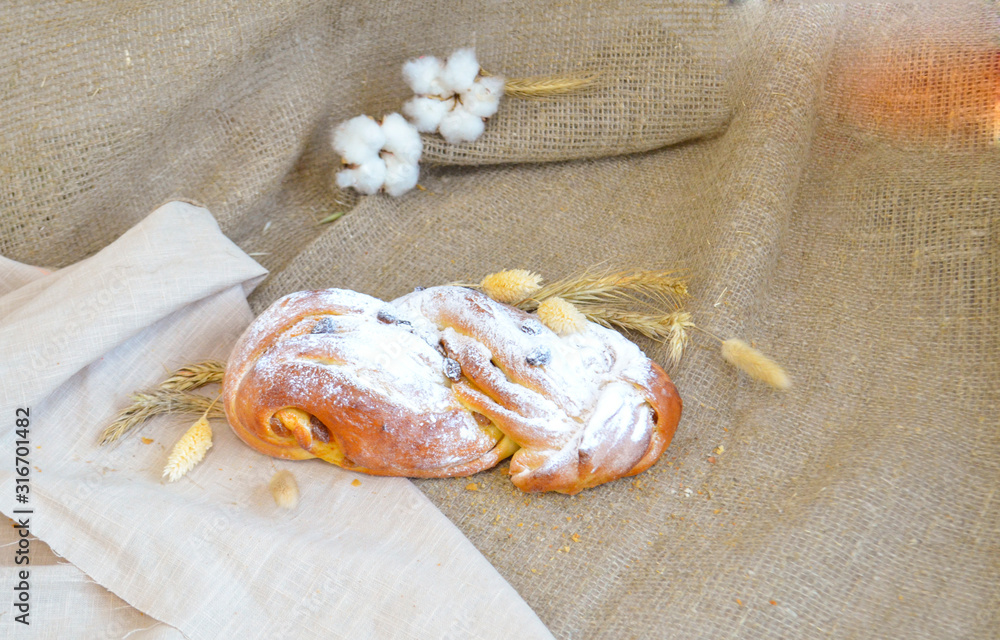 Raisin roll on the tablecloth