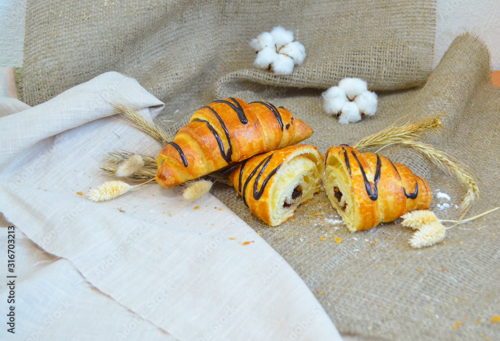 Croissants with chocolate filling on a tablecloth