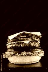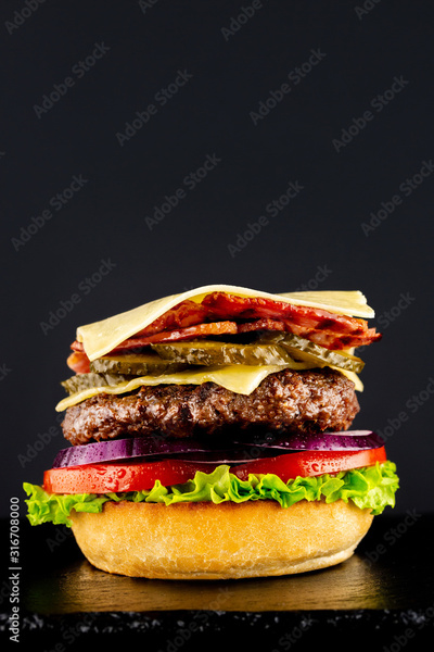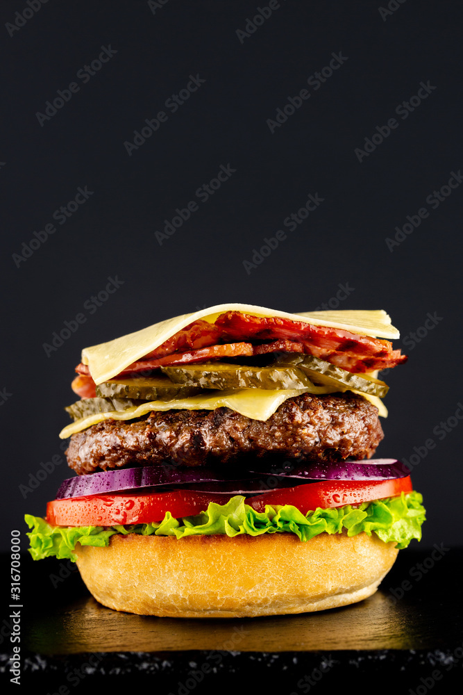 Cooking a burger. Making a sandwich in stages. Build a sandwich. Fresh tasty burger on a black background. Cooking a Classic Burger
