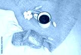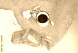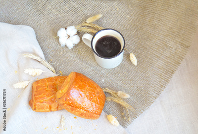 Buns on the tablecloth next to a cup of coffee