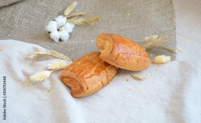 Flaky buns lying on a tablecloth