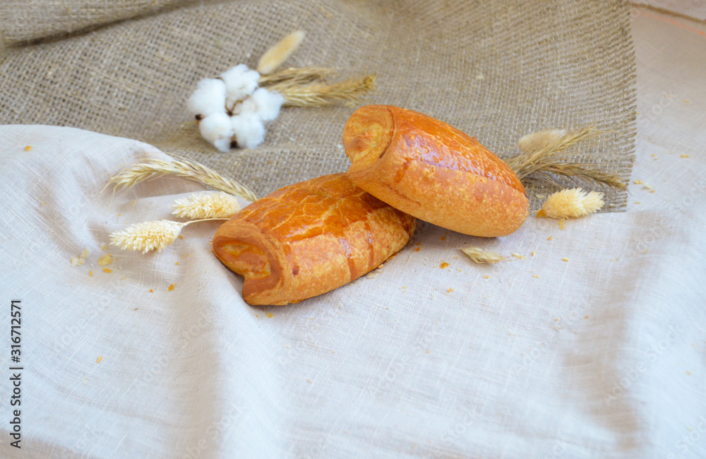 Flaky buns lying on a tablecloth