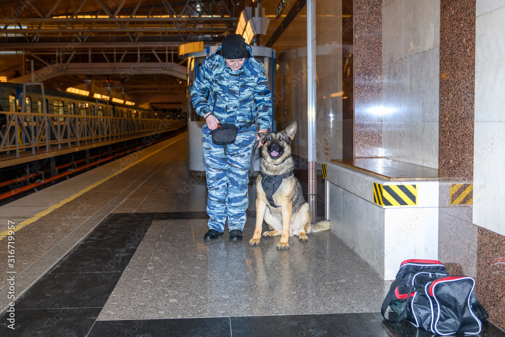 Female police officer with a trained german shepherd dog sniffs out drugs or bomb in luggage. Subway station.
