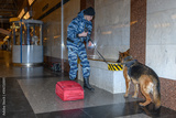 Female police officer with a trained german shepherd dog sniffs out drugs or bomb in luggage. Subway station.
