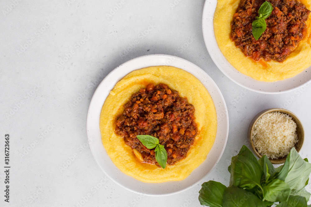 Polenta (boiled cornmeal) with meat-based sauce - ragù alla bolognese.