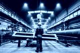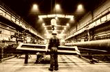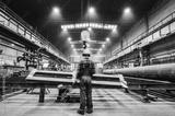 Blue-collar worker operating crane hook in a big factory.