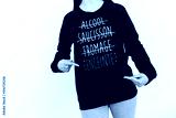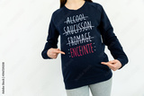 Young pregnant woman holds her belly and shows that she is pregnant - French text