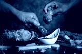 Two hand holding crispy fried chicken dipped in tomato sauce