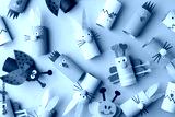 Collection of toys from toilet roll tube for Happy easter decor. A terrible craft. School and kindergarten. Handcraft creative idea, seasonal spring time holiday pattern