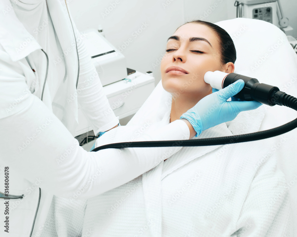 Beautician using an acoustic wave machine rejuvenates the skin of a woman's face. Painless skin rejuvenation