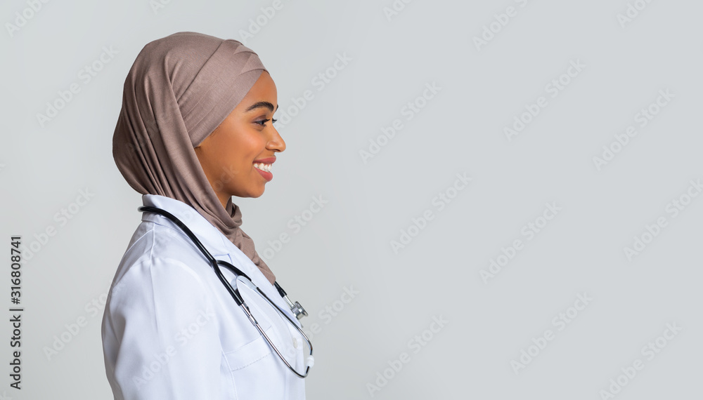 Afro muslim female doctor in hijab and lab coat, profile portrait