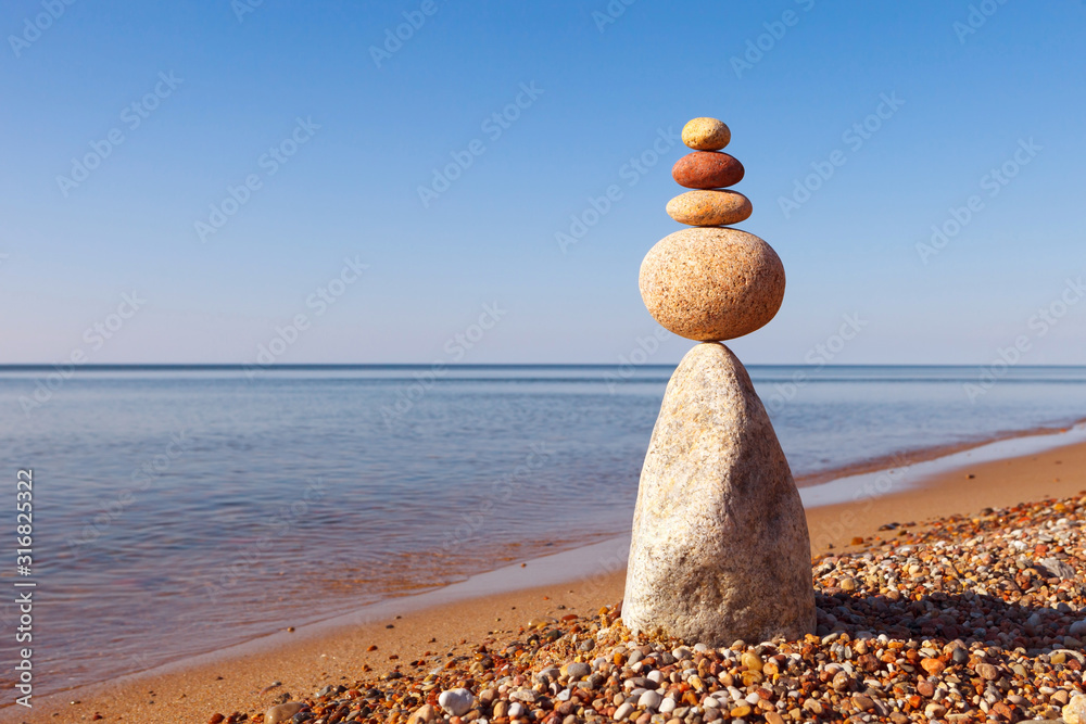 Rock zen pyramid of white and pink pebbles on a background of blue sky and sea.