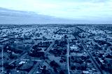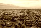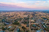 Aerial view of rural road passing through Australian countryside and small settlement at sunset