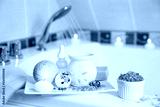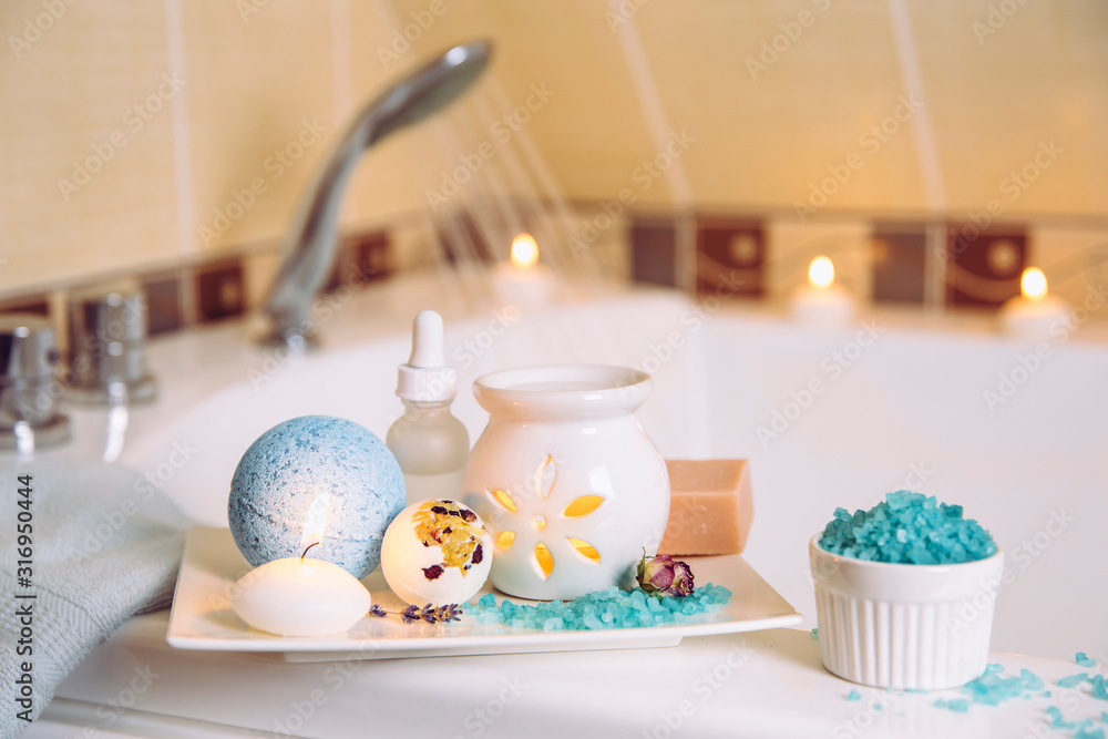 Home spa products on white ceramic tray: bar of soap, bath bomb, aroma bath salt, essential and massage oils, candle burning, aroma oil lamp inside bathroom by tub, water running. Wintertime self care