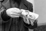 Close-up of man is holding falafel sandwich in paper bag. Healthy street food concept, oriental cuisine.