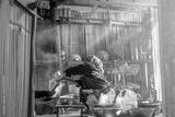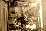 The old hill tribe woman is cooking in her bamboo kitchen with smoke from the bonfire and natural light from outside.