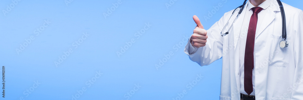 Doctor hand giving thumbs up over blue background. Wide medical banner