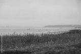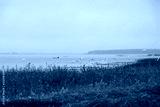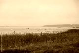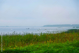 A flock of frightened white herons on Lake Lyubyaz in Ukraine on a foggy morning. Fishing boats on the horizon. Copy space.