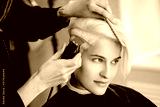 Hairdresser cuts woman client with trimmer. A short haircut, shaved temple and a drawing on the hair.