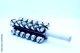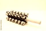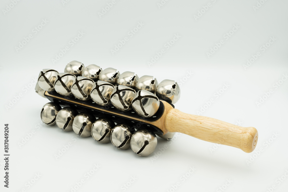 Jingles on a wooden stick lying on a white background