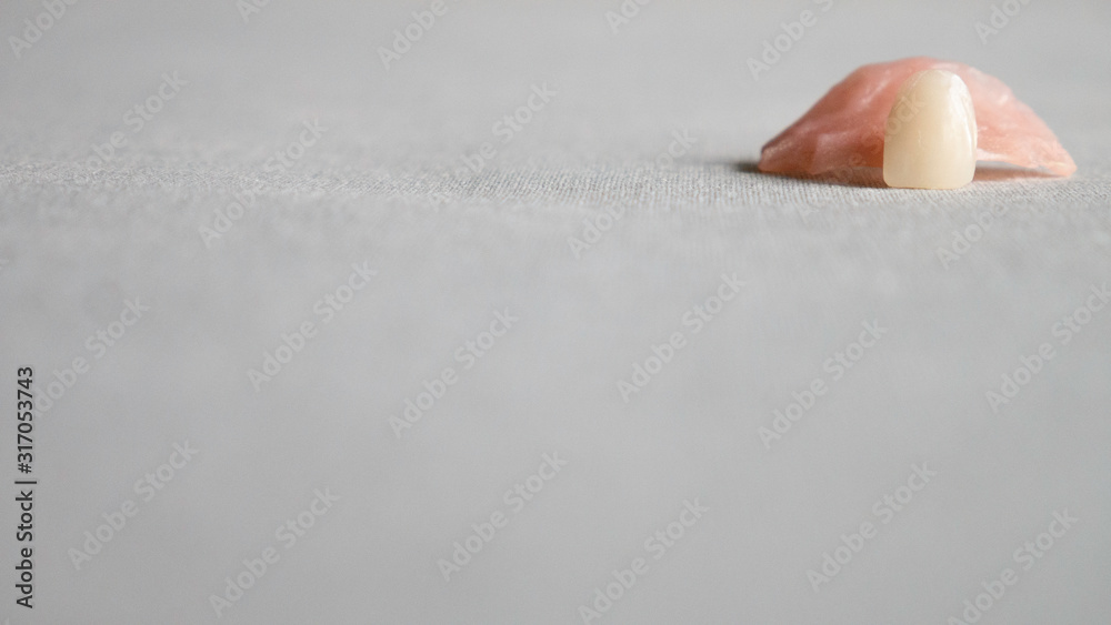 One false plastic tooth. Dental prosthetics on a background. Dentures. Dentistry. Prosthetic teeth. Dental plates. Artificial teeth. Negative space. Copy space area for text.
