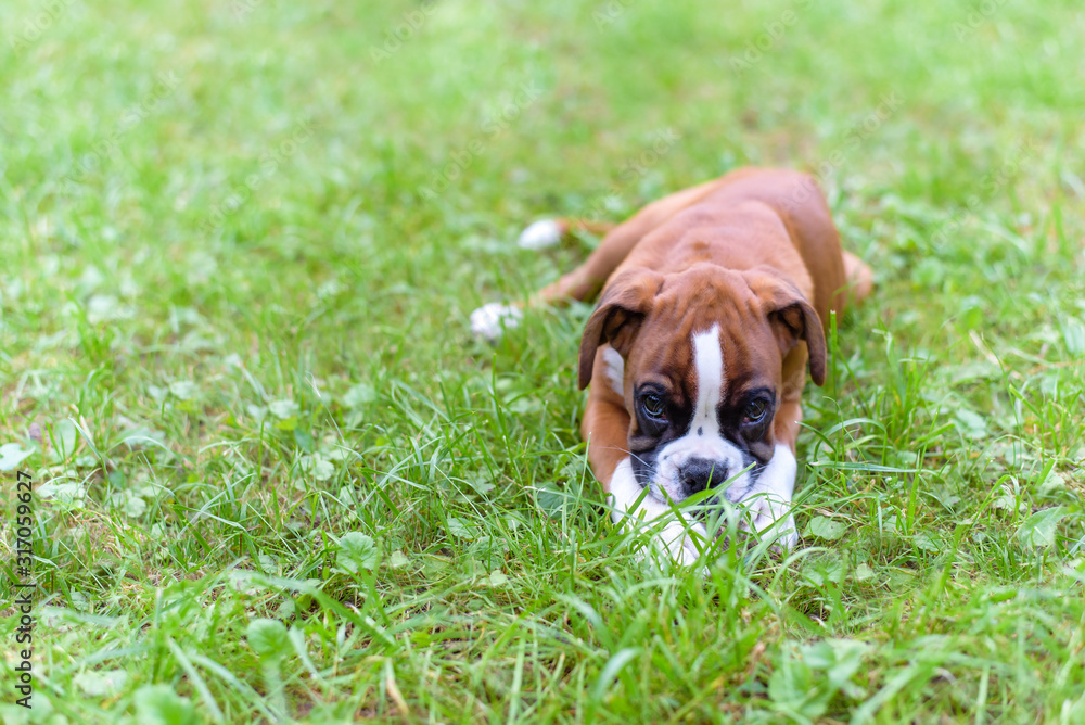 Dog breed boxer puppy laying in the grass on a sunny summer day and nibbles a stick