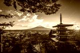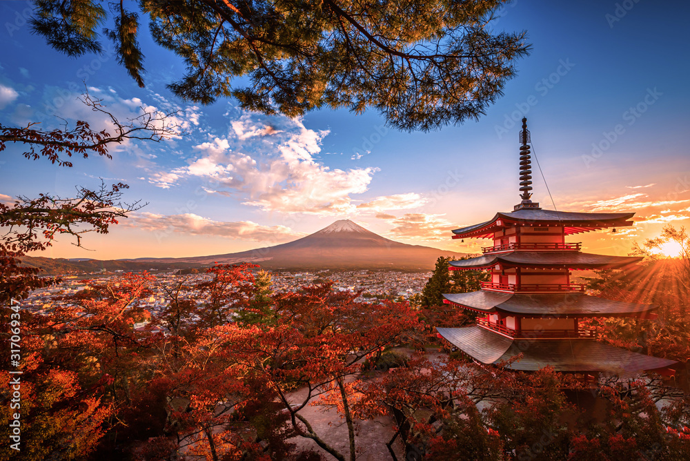 Mt. Fuji with Chureito Pagoda and red leaf in the autumn on sunset at Fujiyoshida, Japan.