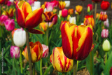 Blooming multicolored tulips close up on a sunny morning in Ukraine.