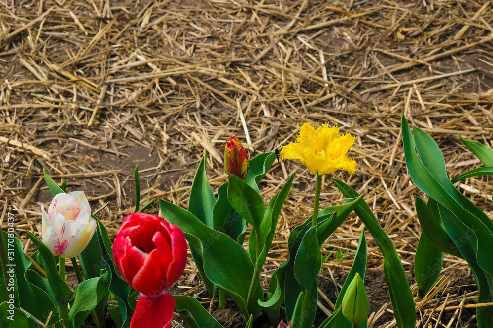 Rare yellow terry tulip with black insect and multicolored tulips on straw background in Ukraine. Top view. Copy space.