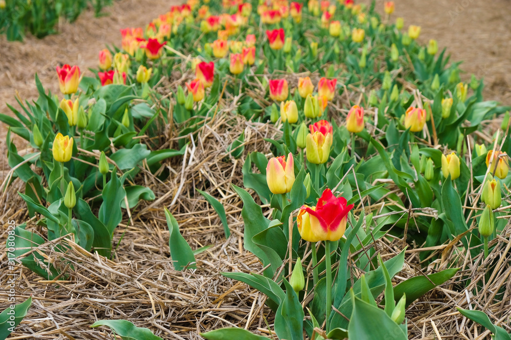 A long row of lush lava color tulips on a field covered with straw on a sunny morning in Ukraine.