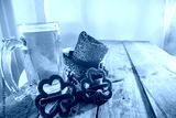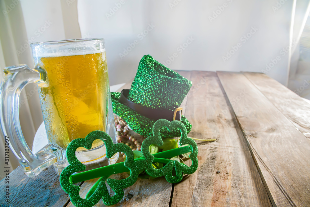 St. Patricks Day green shamrocks with a full cold frosty glass of beer background