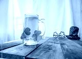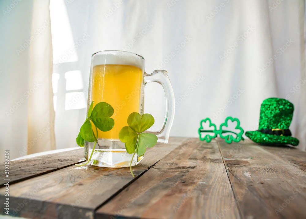 St. Patricks Day green shamrocks with a full cold frosty glass of beer background