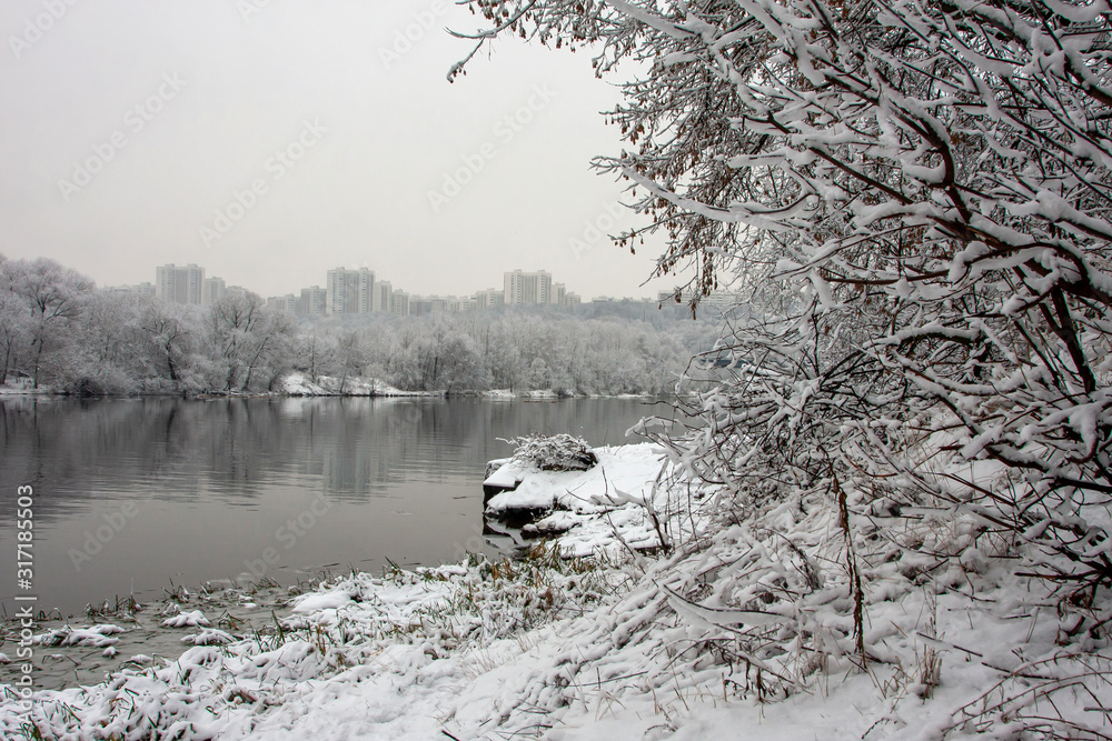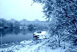 unfrozen river surrounded by snowy trees
